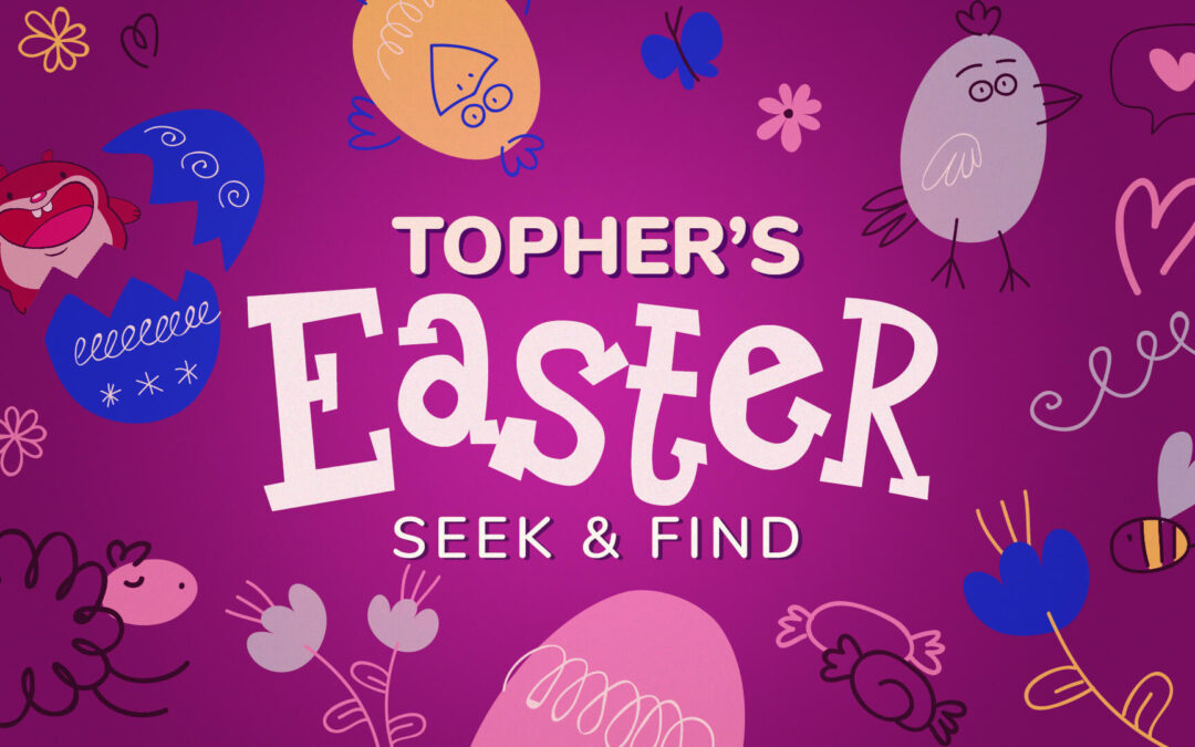 Topher’s Easter Seek and Find- That silly little gopher has done it again and now we have an Easter emergency. Topher the Gopher has hidden our Easter story pictures inside the Bible story drawing. No worries, though! The preschool kids are on the hunt. During “Topher’s Easter Seek and Find,” preschoolers will seek high and low within the drawing to find the hidden pictures. Once found, the pictures will help tell the greatest story ever—the story of a Love that’s more powerful than death.